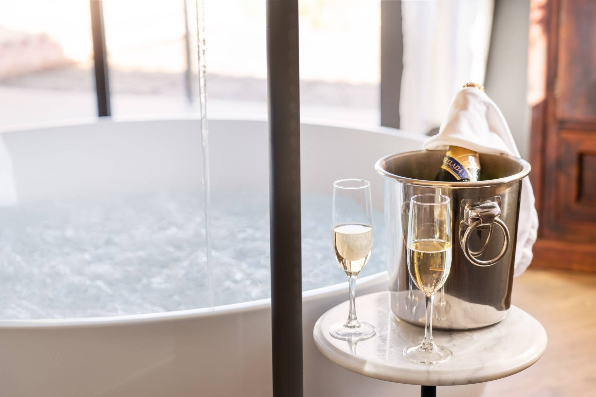 Diese prachtvolle Rückzugsmöglichkeit bietet einen privaten, großzügigen Whirlpool, der Sie dazu einlädt, sich in purem Genuss zu entspannen. Tauchen Sie ein in das warme Wasser und lassen Sie sich von den Blubberblasen umschmeicheln, während Sie den malerischen Ausblick auf die Landschaft genießen