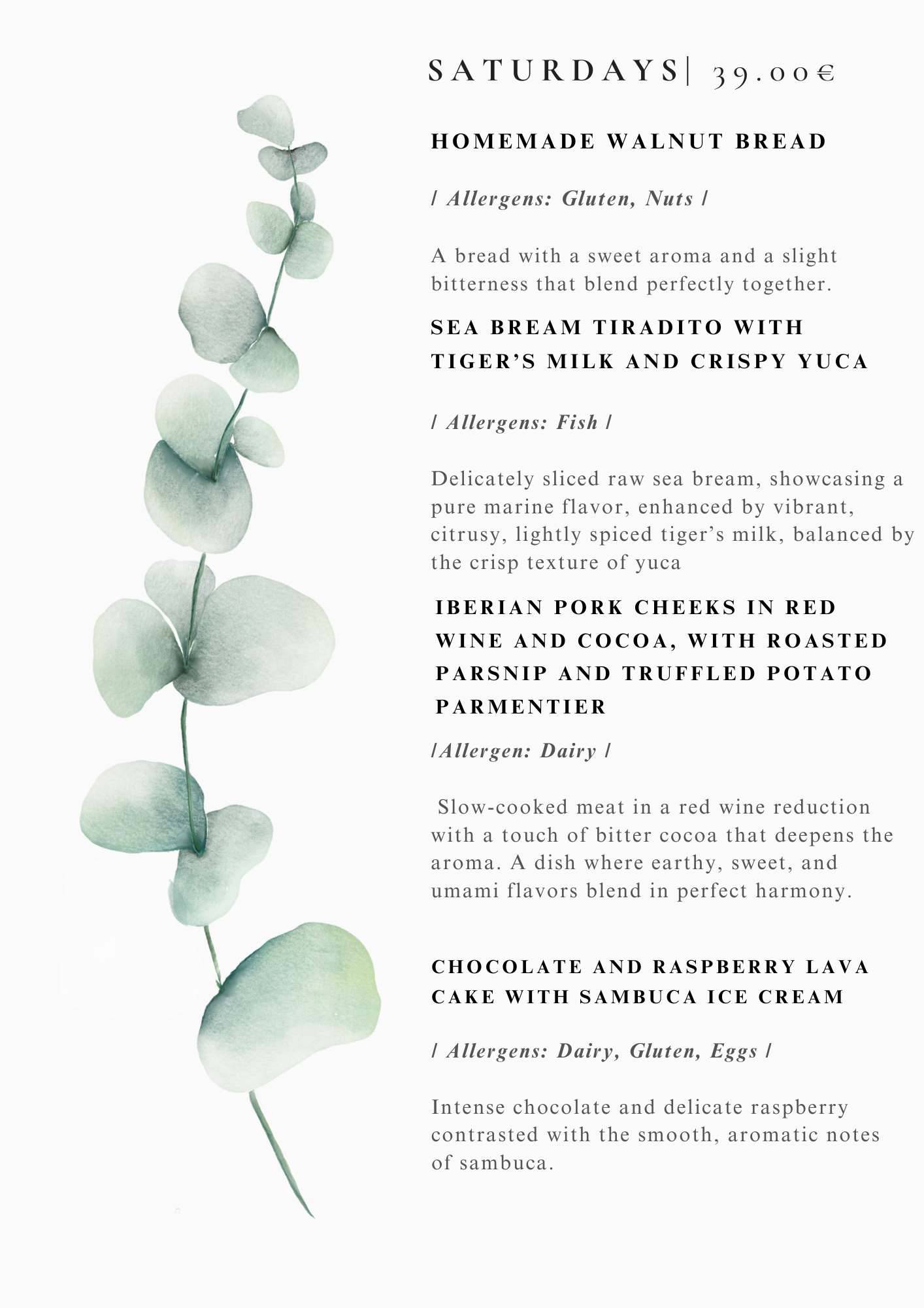 We serve our dinner menus of the best fresh ingredients 7 times a week , prices are usually around 30-39 euro per person VAT incl. please see exact menus depending on day of the week above.