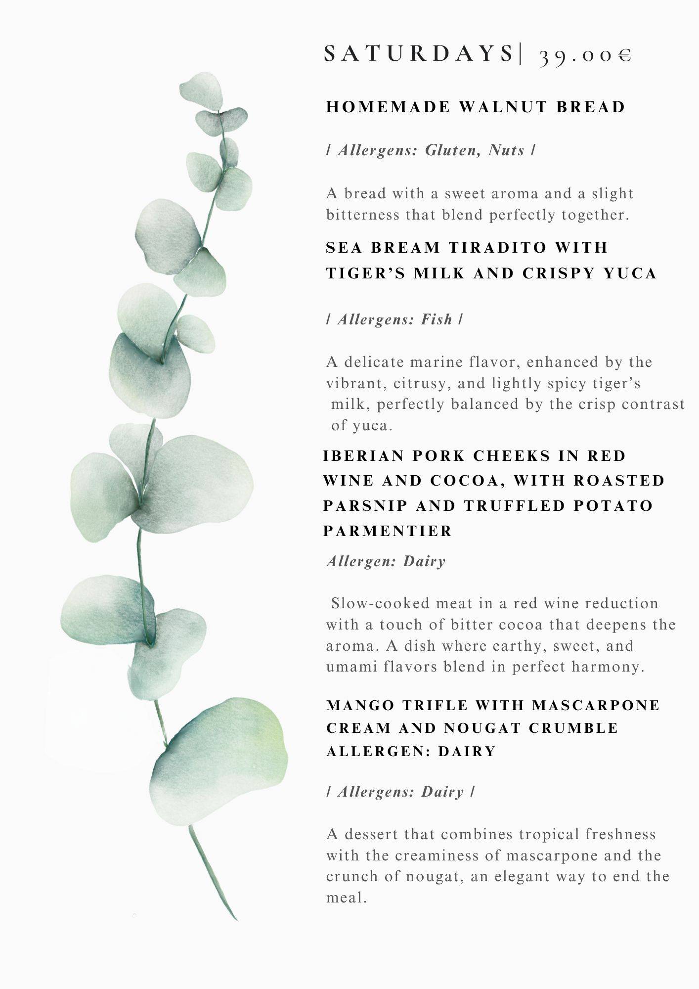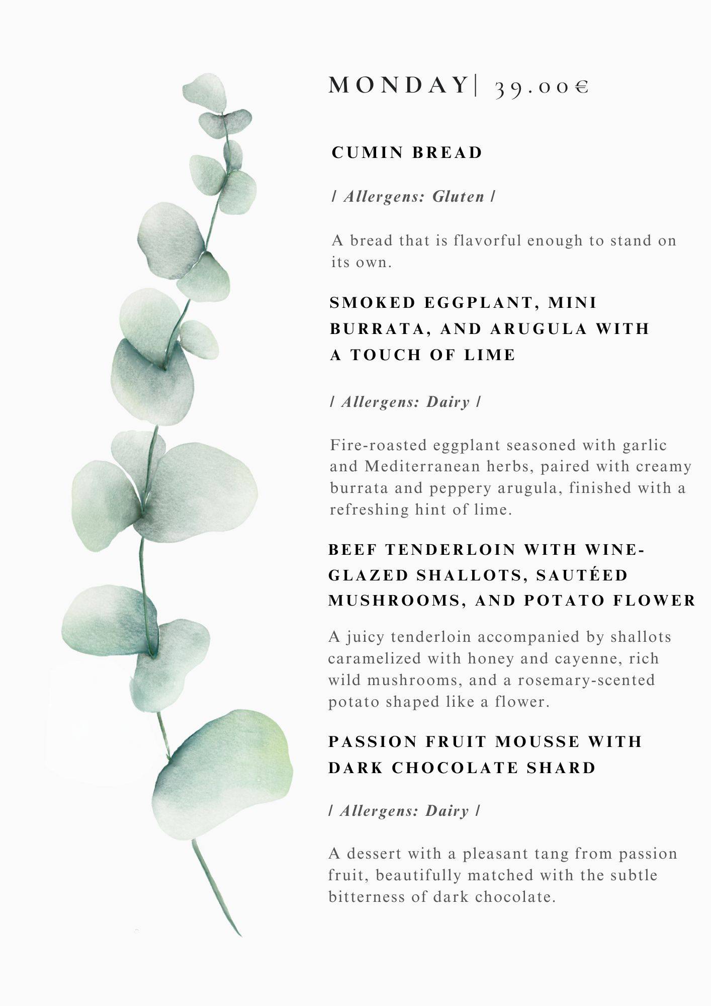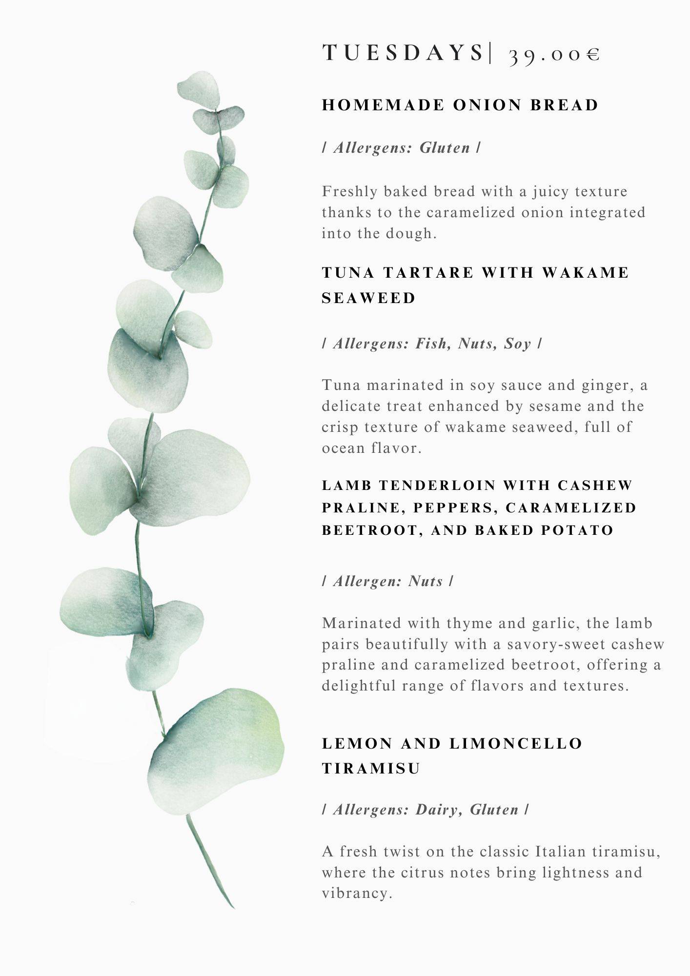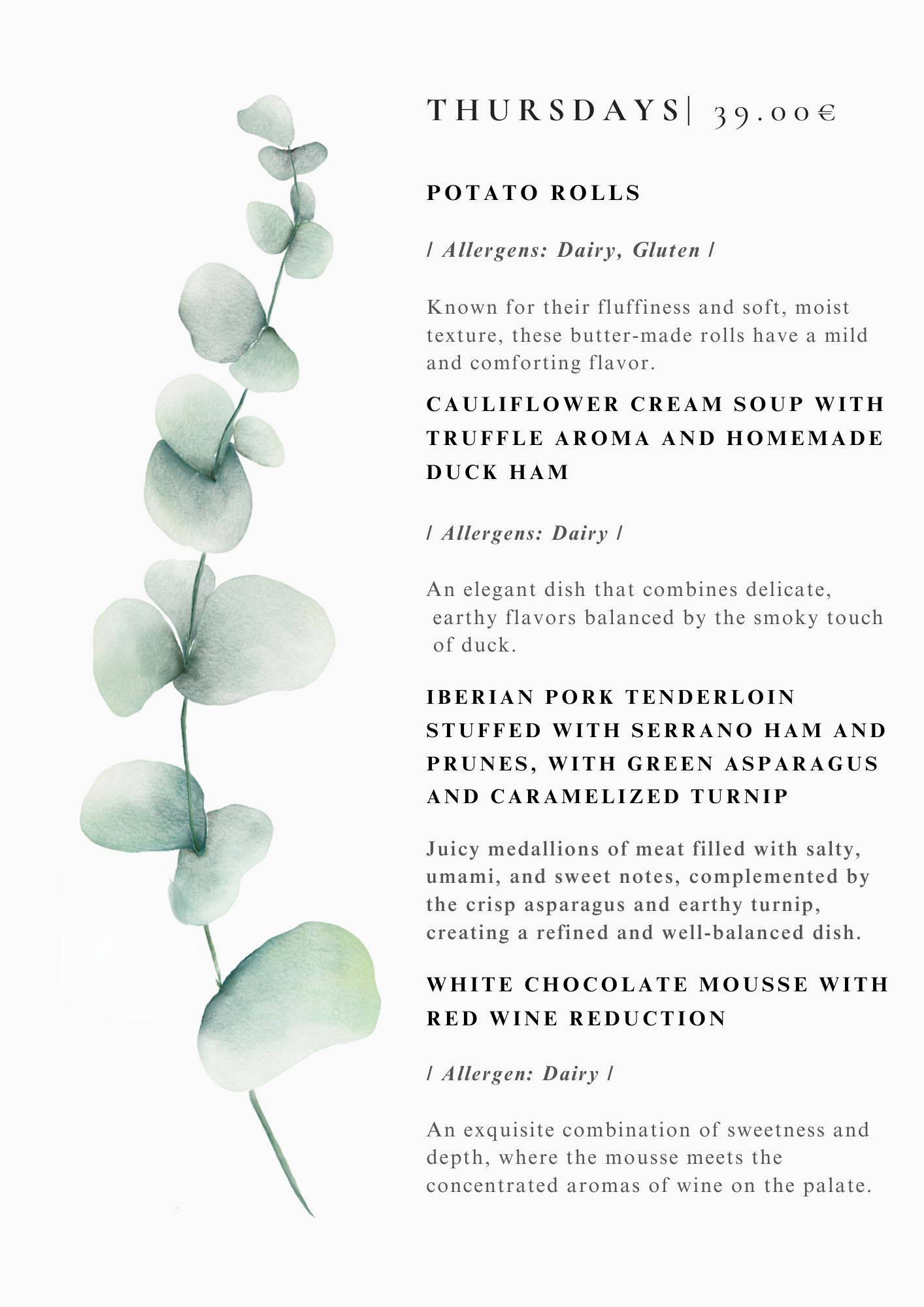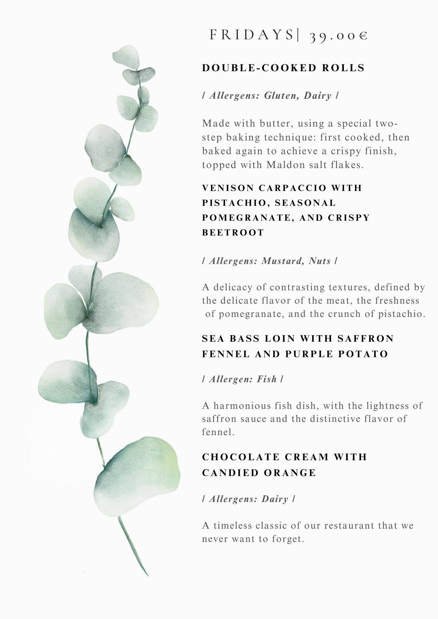 We serve our dinner menus of the best fresh ingredients 7 times a week , prices are usually around 30-39 euro per person VAT incl. please see exact menus depending on day of the week above.