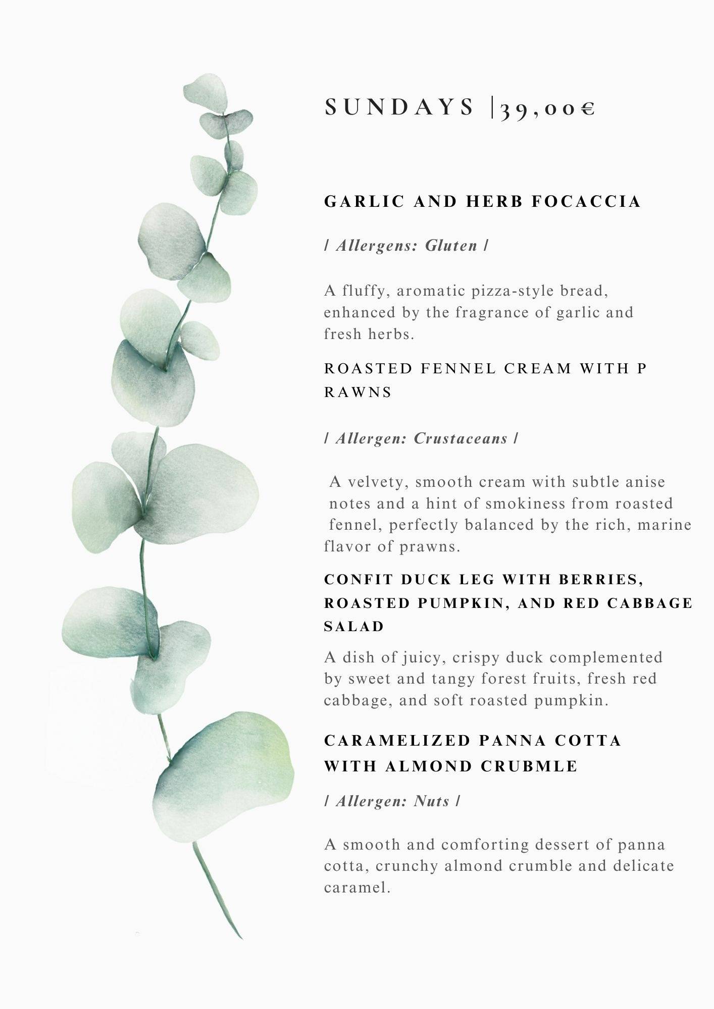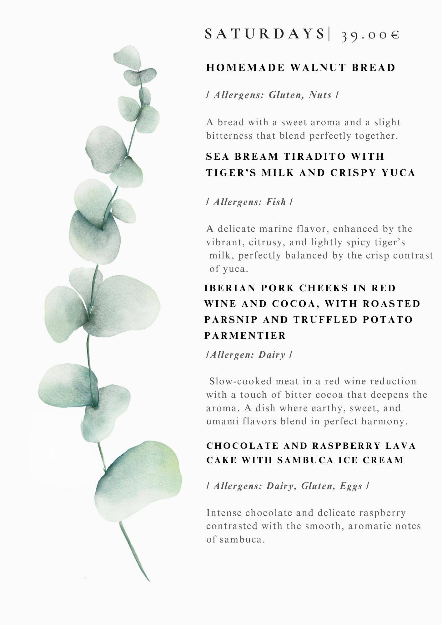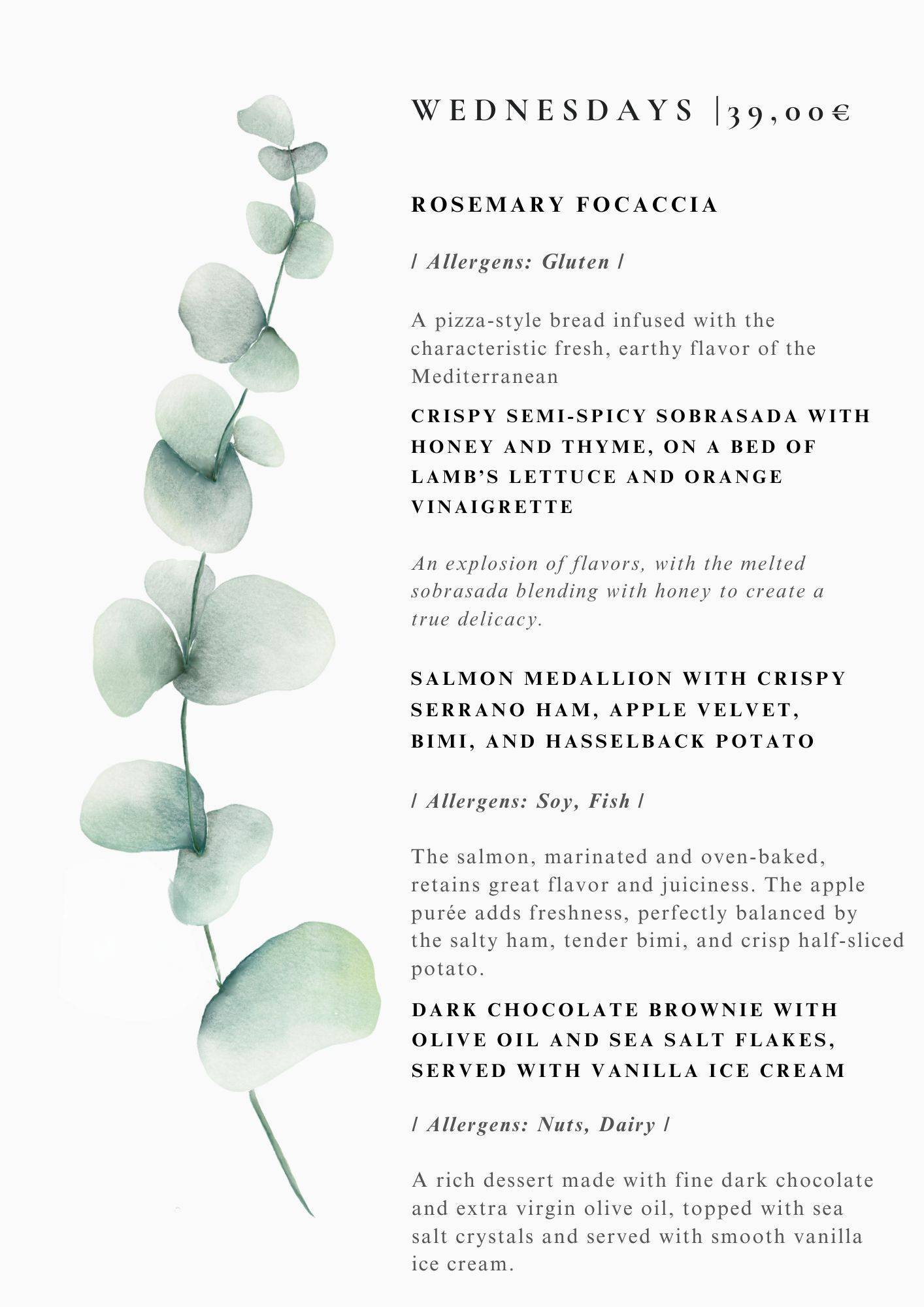 We serve our dinner menus of the best fresh ingredients 7 times a week , prices are usually around 30-39 euro per person VAT incl. please see exact menus depending on day of the week above.